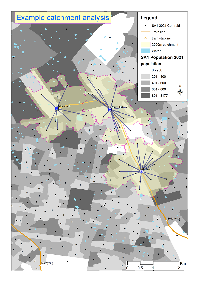 Once the WTP values were estimated, we needed to apply these values to the case of Sydney. To achieve this, a catchment analysis was conducted to estimate the monthly number of train trips per visitor and per resident, respectively. An example is illustrated in the figure below.