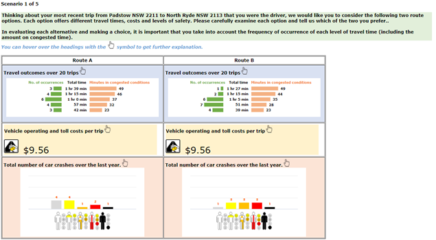 At the core of this national WTP (Willingness to Pay) study is an SP (Stated Preference) experiment that presents participants with five sets of route choices, each comprising two options. These options vary in terms of safety, cost, and travel time, with travel time presented as a range to account for different reliabilities (refer to the figure below).