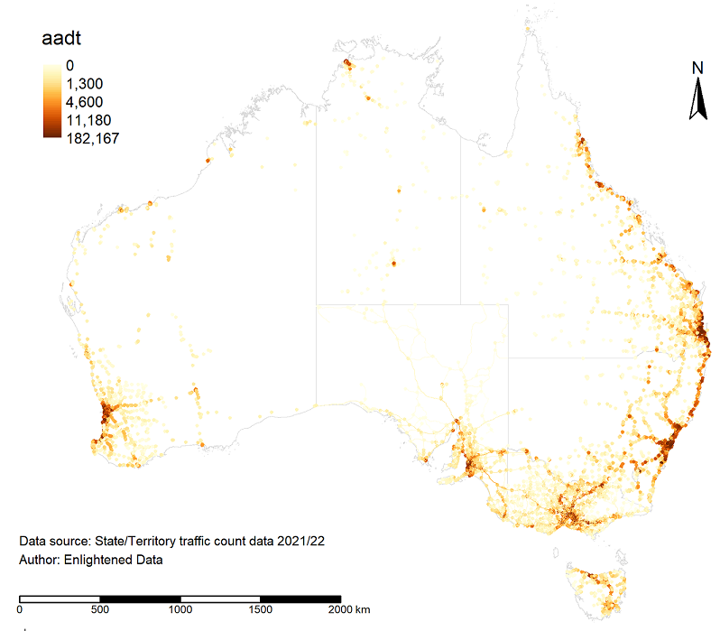 Transport authorities from various states and territories supplied AADT data, which was standardised and indexed by year. In Australia, transport authorities calculate the AADT using traffic count data from counters placed at various locations across the road networks. The placement of these counters, and consequently the data coverage of the AADT, is illustrated in the figure below.