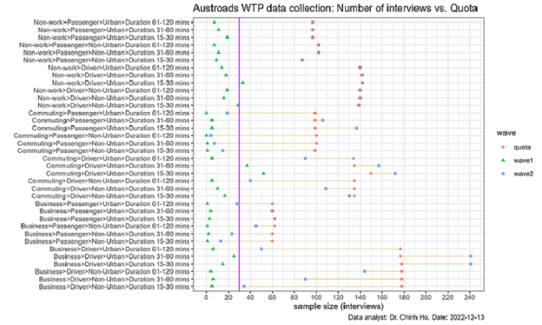 The survey used a stratification sampling with quota to obtain enough samples for the requirement of separate WTP values for different travel purposes. Samples are proportional to the population of each State/Territory. Quotas were also employed for jurisdictions, drivers and passengers, and metropolitan and regional locations to ensure the survey results accurately represented nationwide averages.