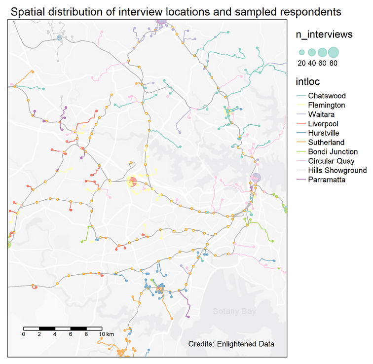 We collaborate with Taverner, who recruited and conducted face-to-face surveys across 10 stations in Sydney. The interview locations and respondents are shown in the figure below. These locations were chosen to encompass the geography of Greater Sydney as well as to include different types of station users such as residents, visitors, and non-rail users.
