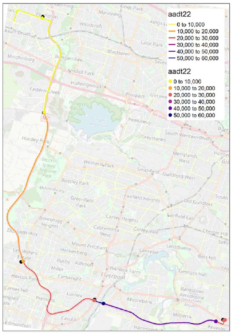Survey respondents were asked to provide the suburbs of origin and destination for their trips, enabling the determination of an optimal route (shortest time) via Google Maps. A total of 3,885 unique routes were identified for all origin-destination pairs among the surveyed individuals, excluding intra-zonal trips. The reported trips covered a broad geographical area of Australia, ranging from urban to regional locations. AADTs for the route segments of each trip were estimated for all identified routes observed in the entire survey sample. Given that the AADT varies along each trip’s route, a distance-weighted average was calculated after mapping the traffic count data to each route and dividing it into segments. The figure below illustrates the developed method, using an example route from Bankstown to Mount Druitt in Sydney, which passed through several traffic counters (represented by dots) that provide AADT data (shaded in different colours).