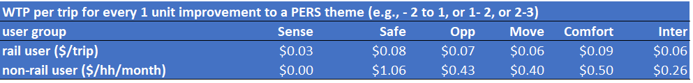 Using this average, we calculate the average WTP per use for rail users. To estimate the annual non-use value in business cases, one can simply multiply the $/household/month by 12 months and the total number of non-rail households residing within the station precinct (e.g., within 1km).